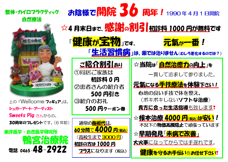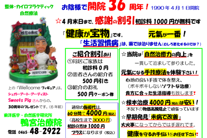 「鴨宮治療院」は、4月1日で36周年を迎えることができました